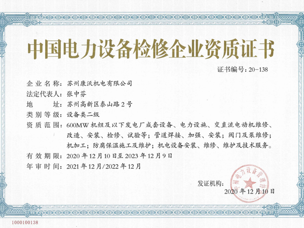 中國電力設備檢修企業資質證書